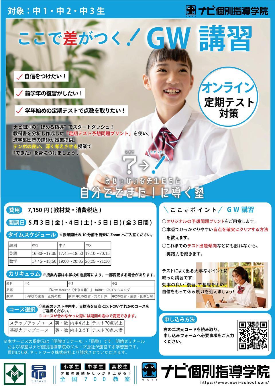 グループ会社である愛知県の学習塾「明倫ゼミナール」、滋賀県の学習塾「昴塾」とのコラボ企画として、中1~中3の皆様にオンラインのGW講習をご案内いたします。