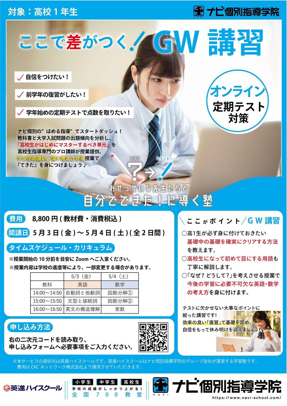 グループ会社である群馬県の学習塾「英進ハイスクール」とのコラボ企画として、高1の皆様にオンラインのGW講習をご案内いたします。