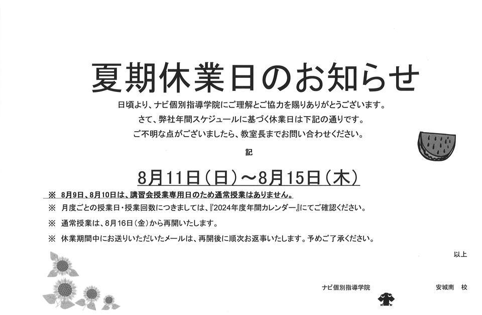 夏季休業日のご案内です。