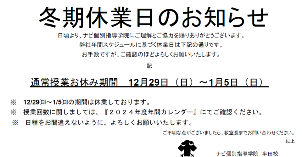 12月29日(日)~1月5日(日)は冬期休業になります。