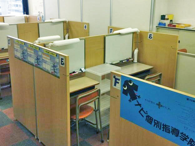 ナビ個別指導学院の授業は、個別の席ごとに設置された自分専用のホワイトボードで解き方や考え方を一緒に確認、それから生徒が問題を解くという「個別授業」スタイルです。