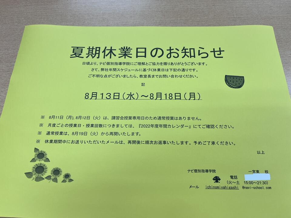 ここからはナビ個別指導学院の夏期休業についてお知らせします。