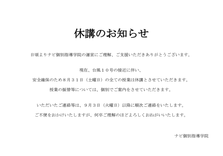 現在、台風10号の接近に伴い、 安全確保のため8月31日(土曜日)の全ての授業は休講とさせていただきます。