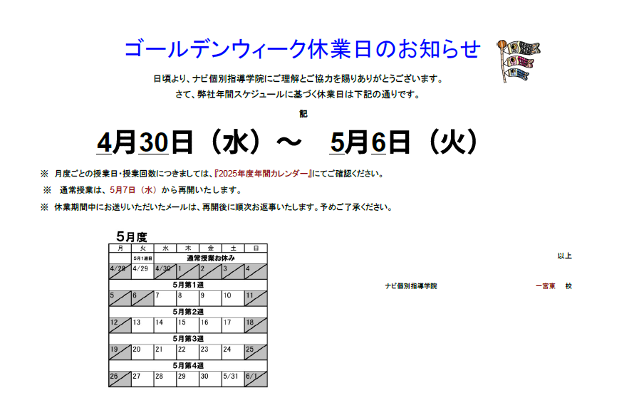 ここからはナビ個別指導学院のGW休業についてお知らせします。