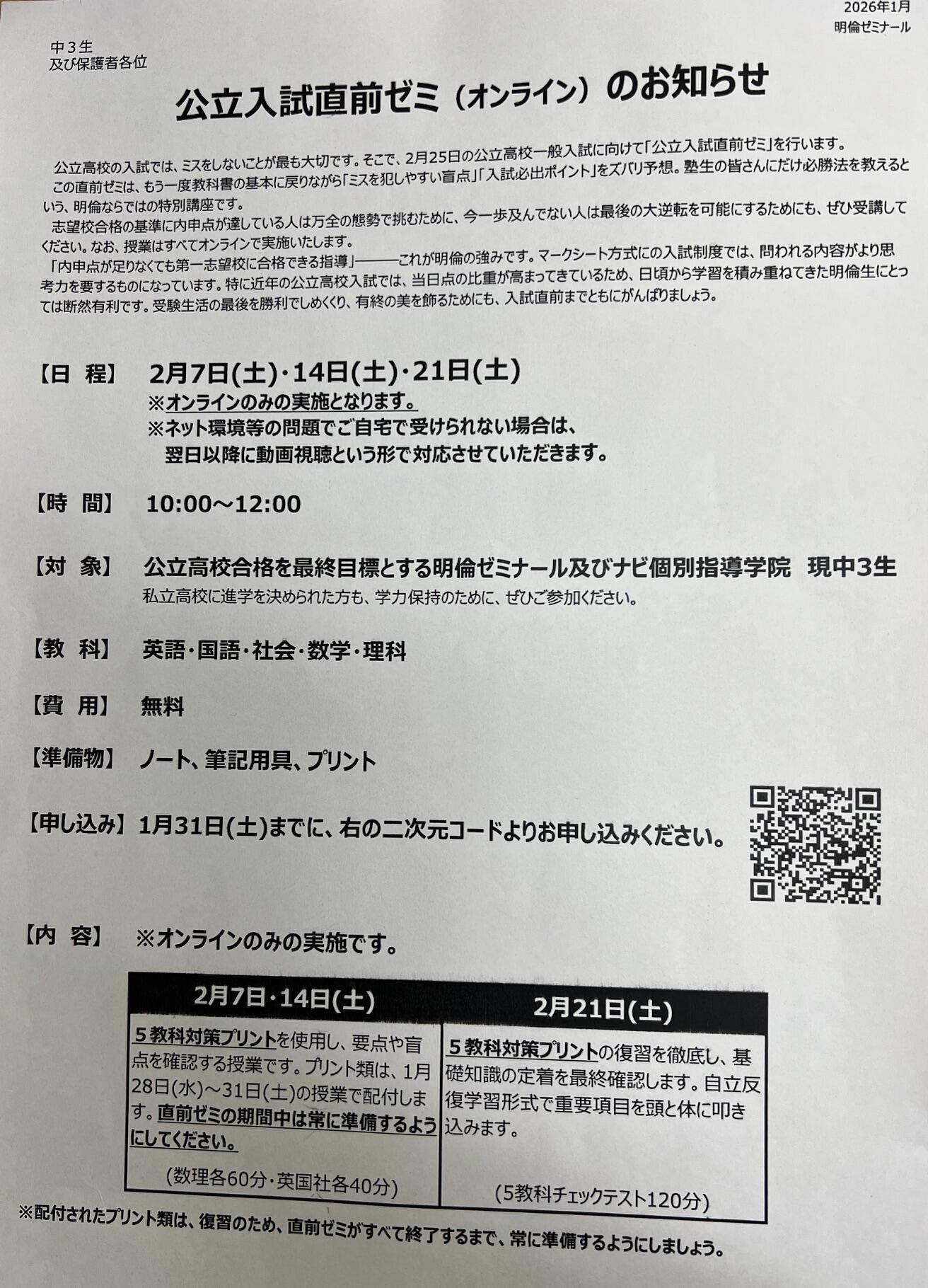 今日は中3生向けのイベントの連絡です。(参加費無料!)
