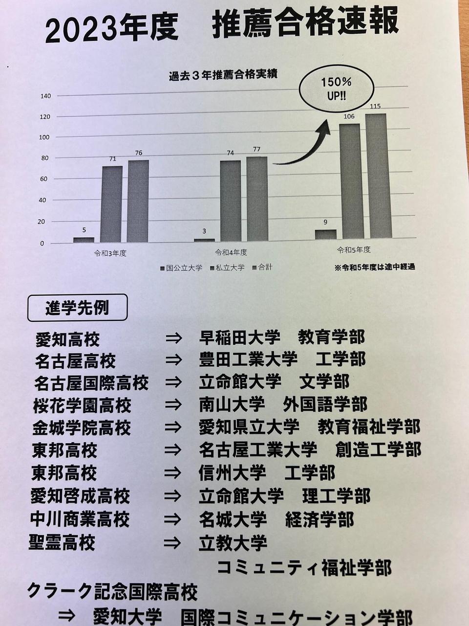 ①大学合格は推薦入試での割合が増えており(現在は定員の6~7割が推薦生)この先更に増える見込み。