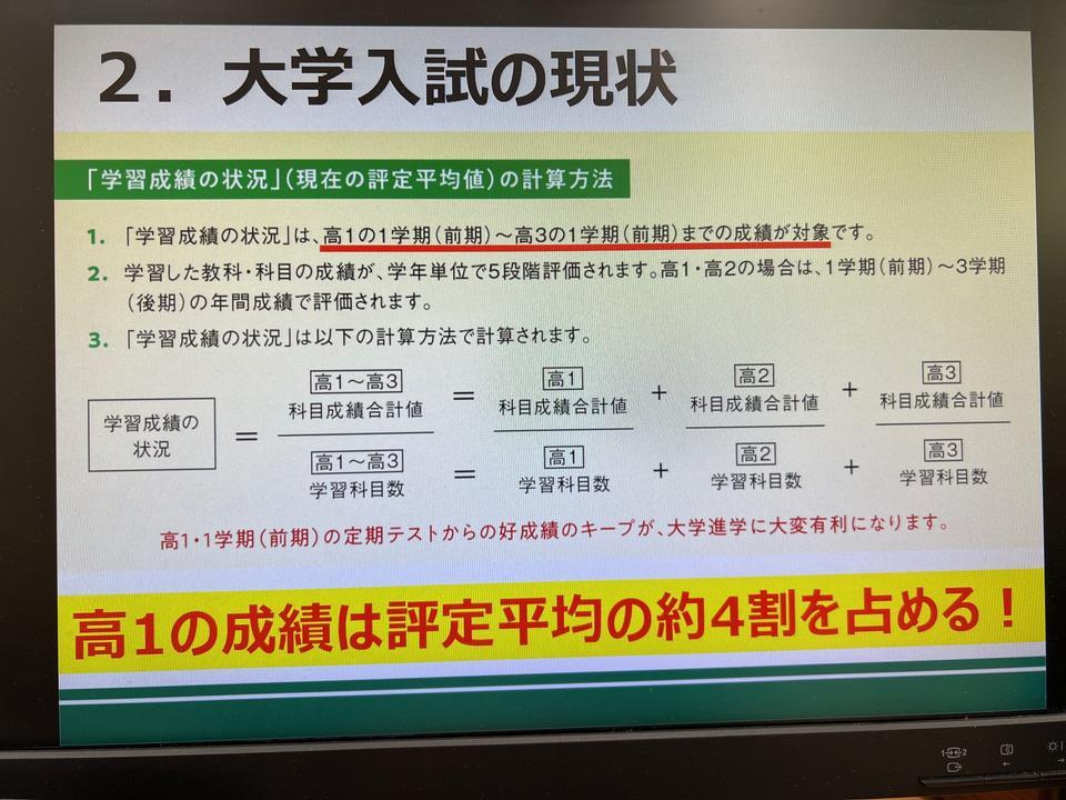 ・高校入試と大学入試の違い(例:高校入試は内申点の合計、大学入試は高1.2の評定平均値 が重要視される、など)