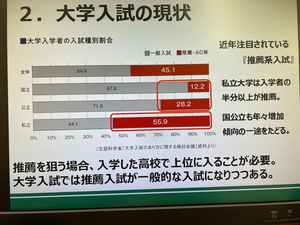 ・大学入試の変遷(例:現在定員の6割近くは「推薦入試」で決まること、など)
