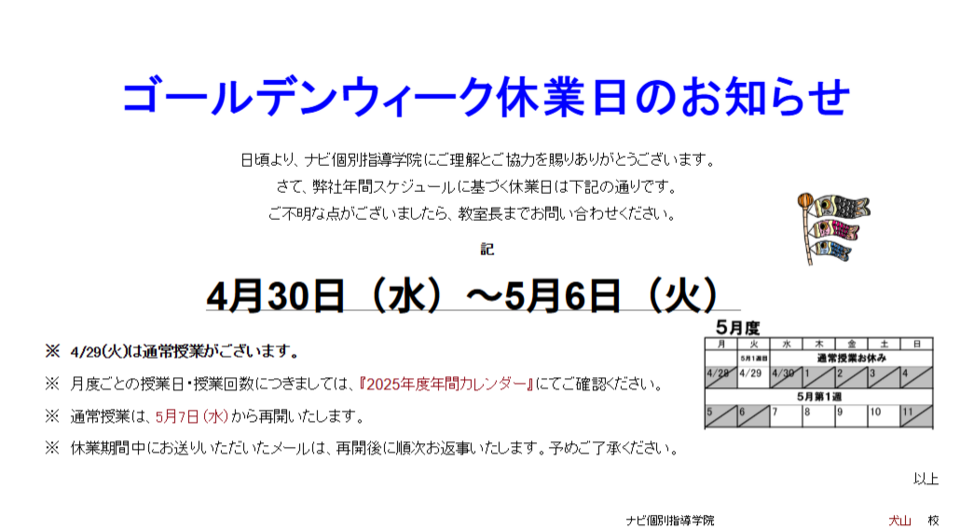 さて、弊社年間スケジュールに基づく休業日は右記の通りです。