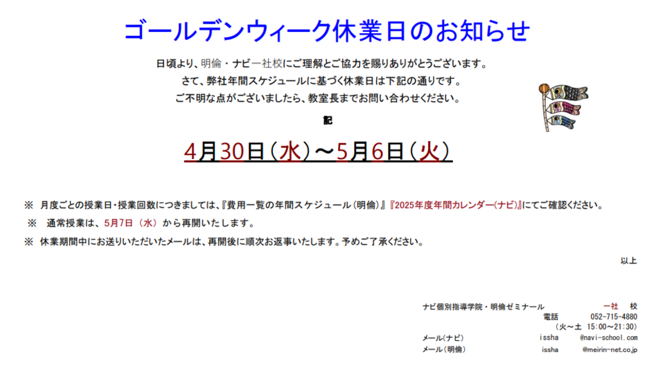 ナビ個別指導学院一社校は4/30(水)~5/6(火)の間はGW休業です。