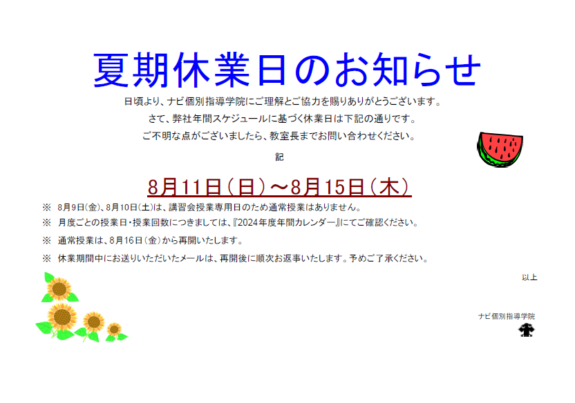 8月11日(日)~8月15日(木)までは夏期休業日となります。