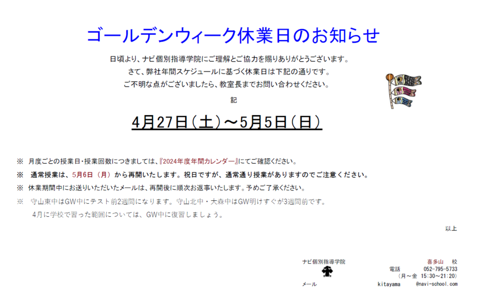 ※ 通常授業は、5月6日(月)から再開いたします。祝日ですが、通常通り授業がありますのでご注意ください。