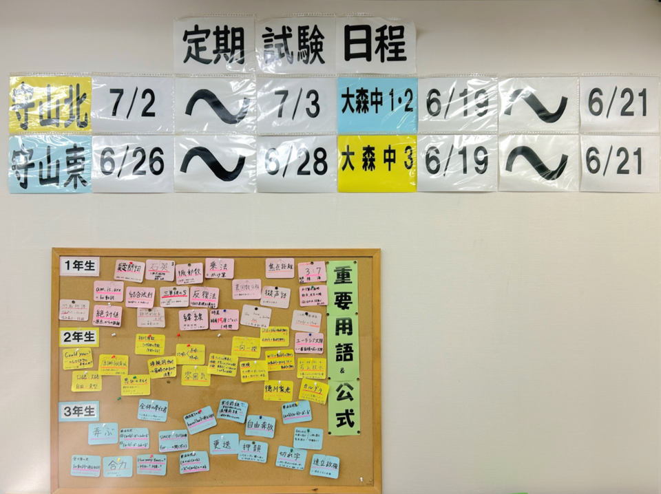 守山北中は今週が修学旅行、守山東中はテスト前1週間のタイミングで修学旅行です。早めのテスト対策をしましょう。