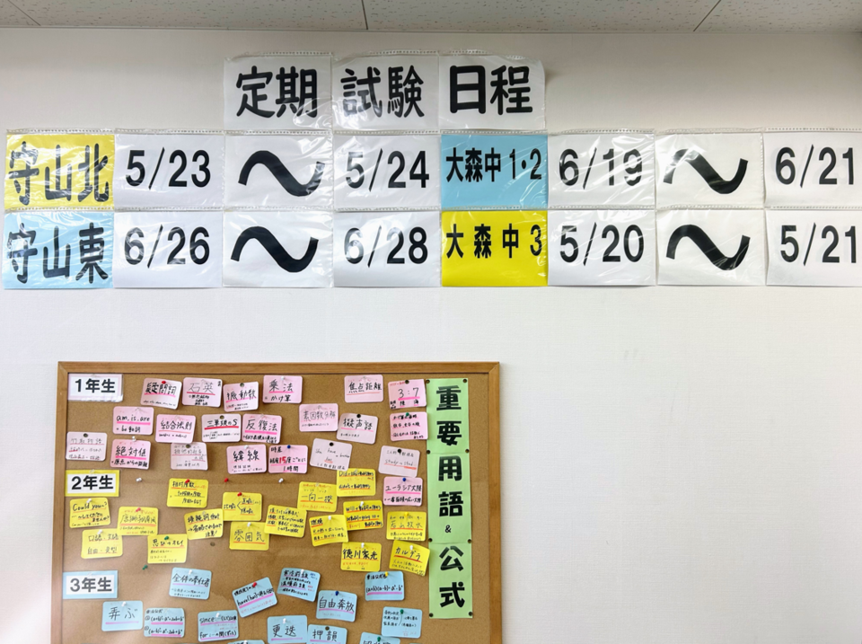 ただ、今回は先に期末テストの話をしましょう。3期生の学校で1学期中間テストがある場合、1学期期末テストは6月下旬にあります。大森中は6月19日、守山東中は6月26日、守山北中は7月2日です。大体どの中学校も4週間後にすぐ期末テストです。