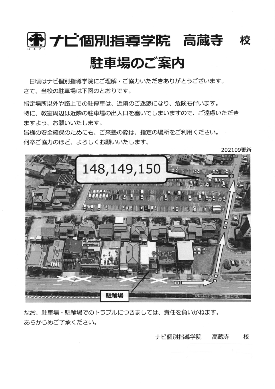 当塾の裏側にございます駐車場の148.149.150がご利用いただけます。