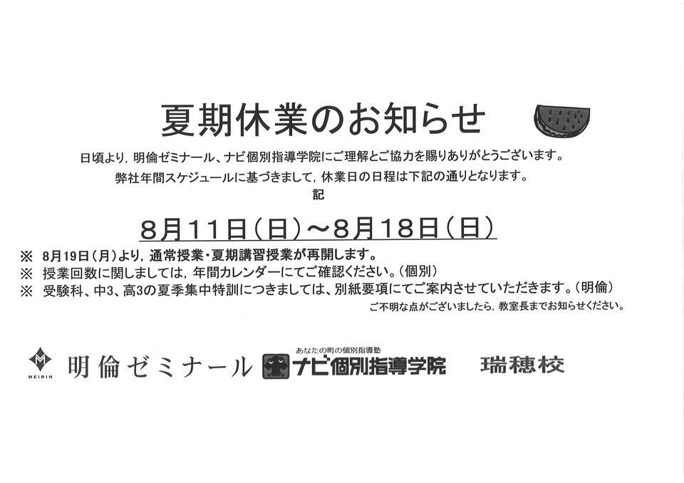 夏期講習、通常授業は8月20日(火)から再開となります。