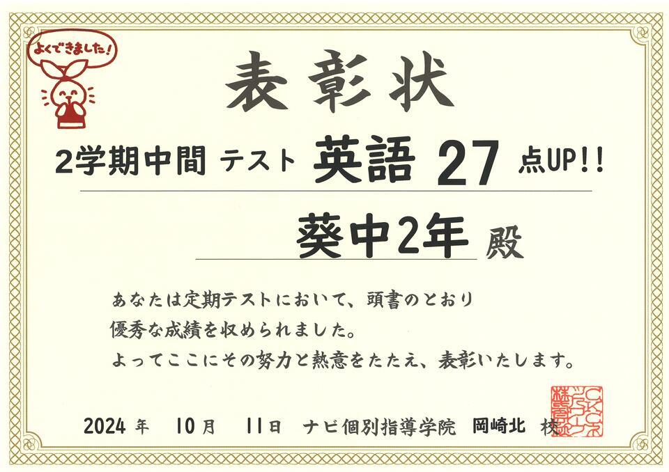 こちらの生徒さんは、英語において27点の成績向上を達成しました。
