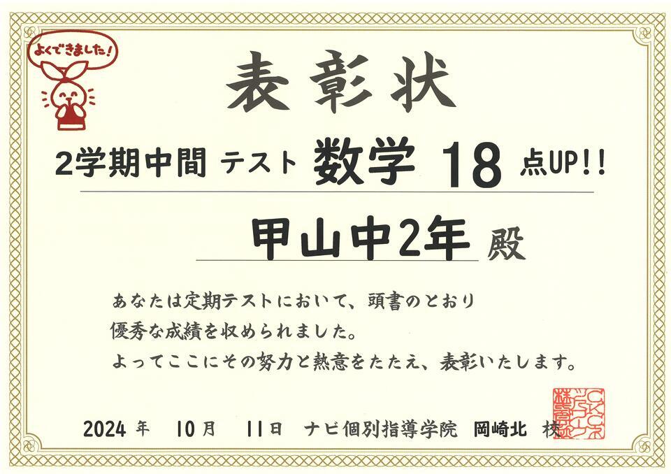 こちらの生徒さんは、数学において18点の成績向上を達成しました。