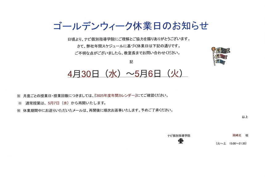 今回は、ゴールデンウィーク休業日のお知らせです。