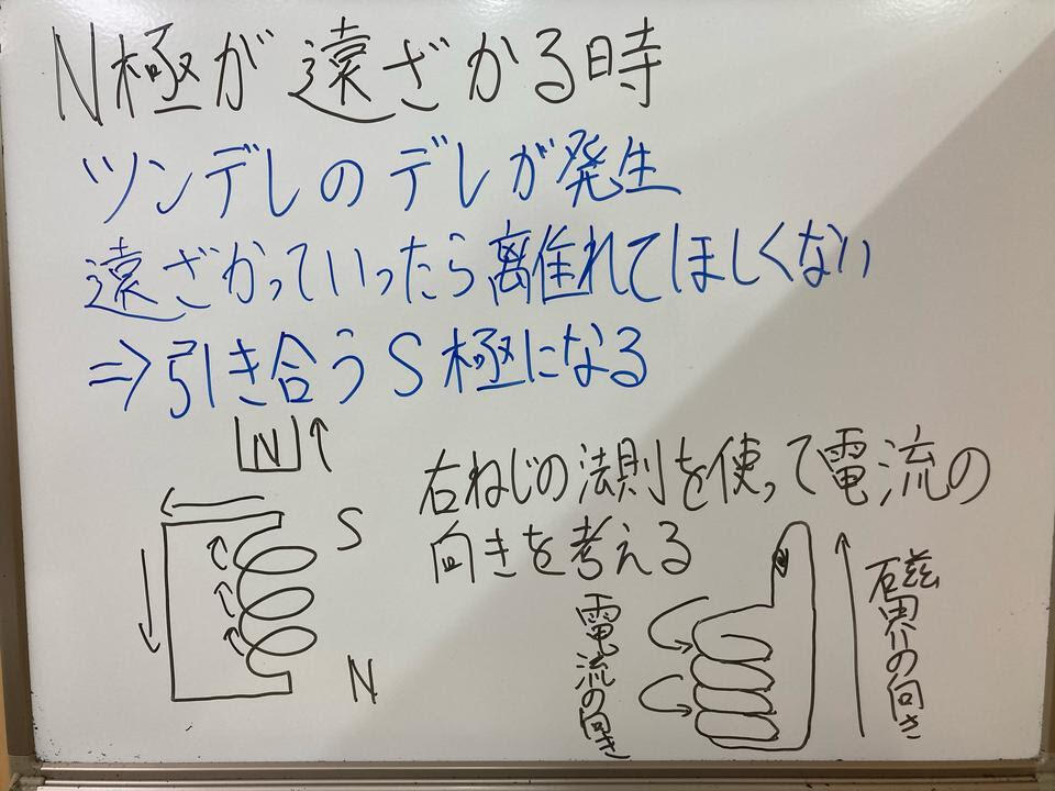 【問題:S極が上から近付いてきたときはコイルの上は何極になるでしょう?】 (答えは最後に!)