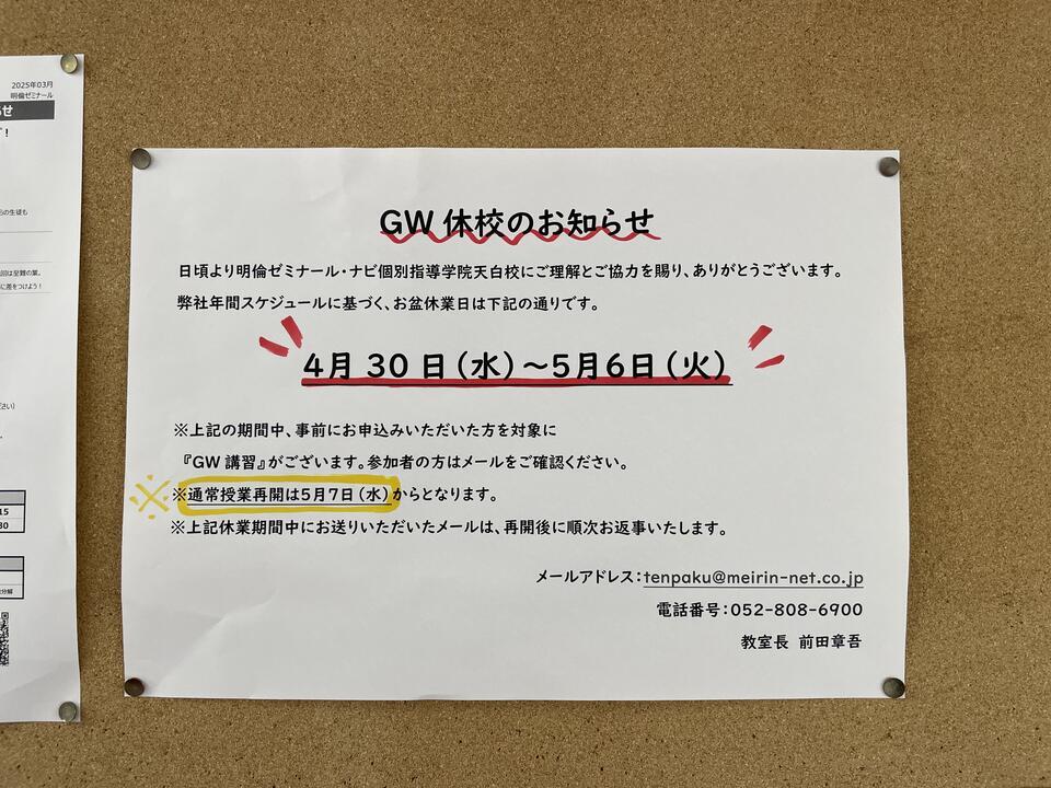 いつもお世話になっております。 ナビ個別指導学院天白校です。 4月30日(水)~5月6日(火)の期間は 「GW休校」でお休みです。 校舎の開校もしておりませんので、ご注意ください。 ご用の際は【メール・マナコム・e-navi】でお知らせください。 ※返信は翌営業日になります。ご了承ください。 よろしくお願いいたします。 天白校