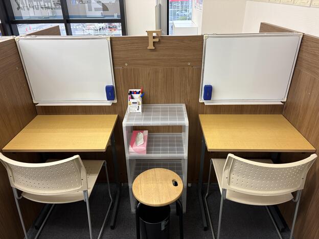 ナビ個別指導学院の授業は、個別の席ごとに設置された自分専用のホワイトボードで解き方や考え方を一緒に確認、それから生徒が問題を解くという「個別授業」スタイルです。