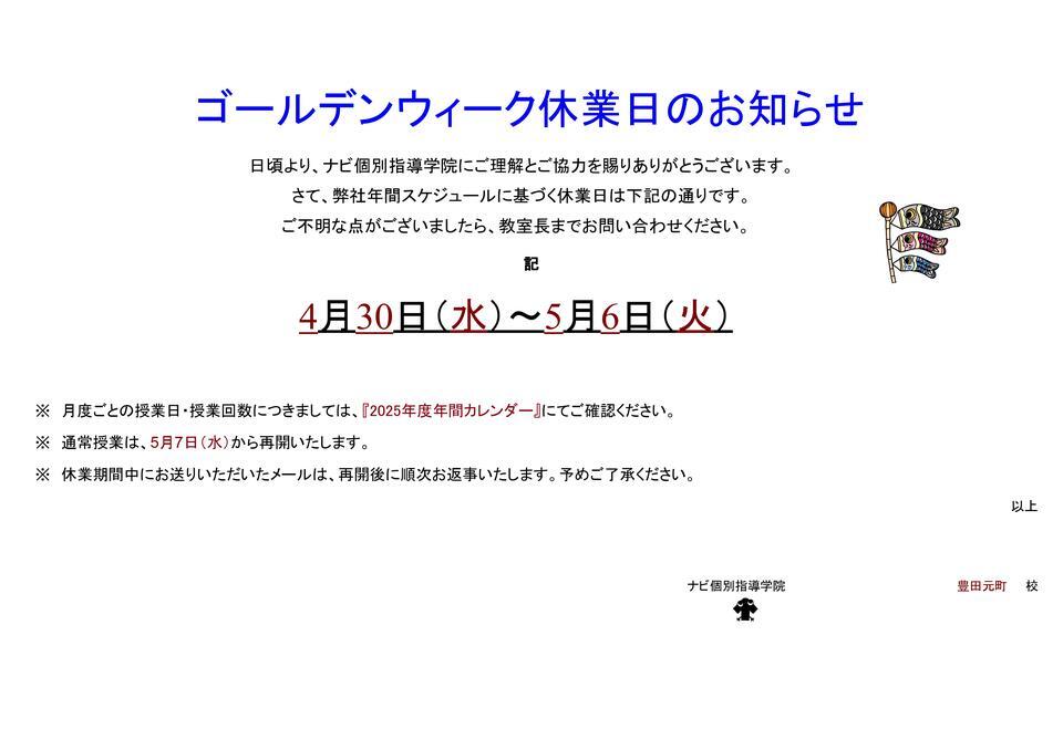 ゴールデンウィーク休業日のお知らせ日頃より、ナビ個別指導学院にご理解とご協力を賜りありがとうございます。さて、弊社年間スケジュールに基づく休業日は下記の通りです。