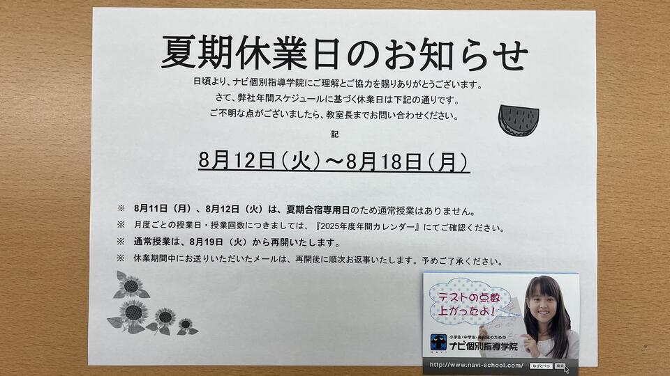 今週で夏休みも終わる予定ですが、生徒のみなさんに宿題の進み具合を聞いてみると、順調に進められている生徒さんが多く、非常に嬉しいです。