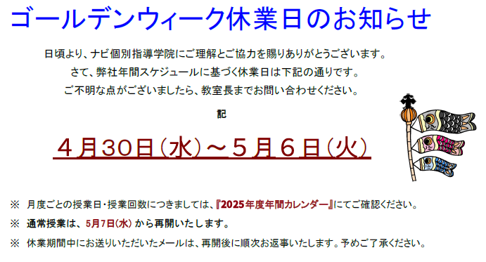 この期間は通常授業も講習会も自習室開放もしておりませんので、