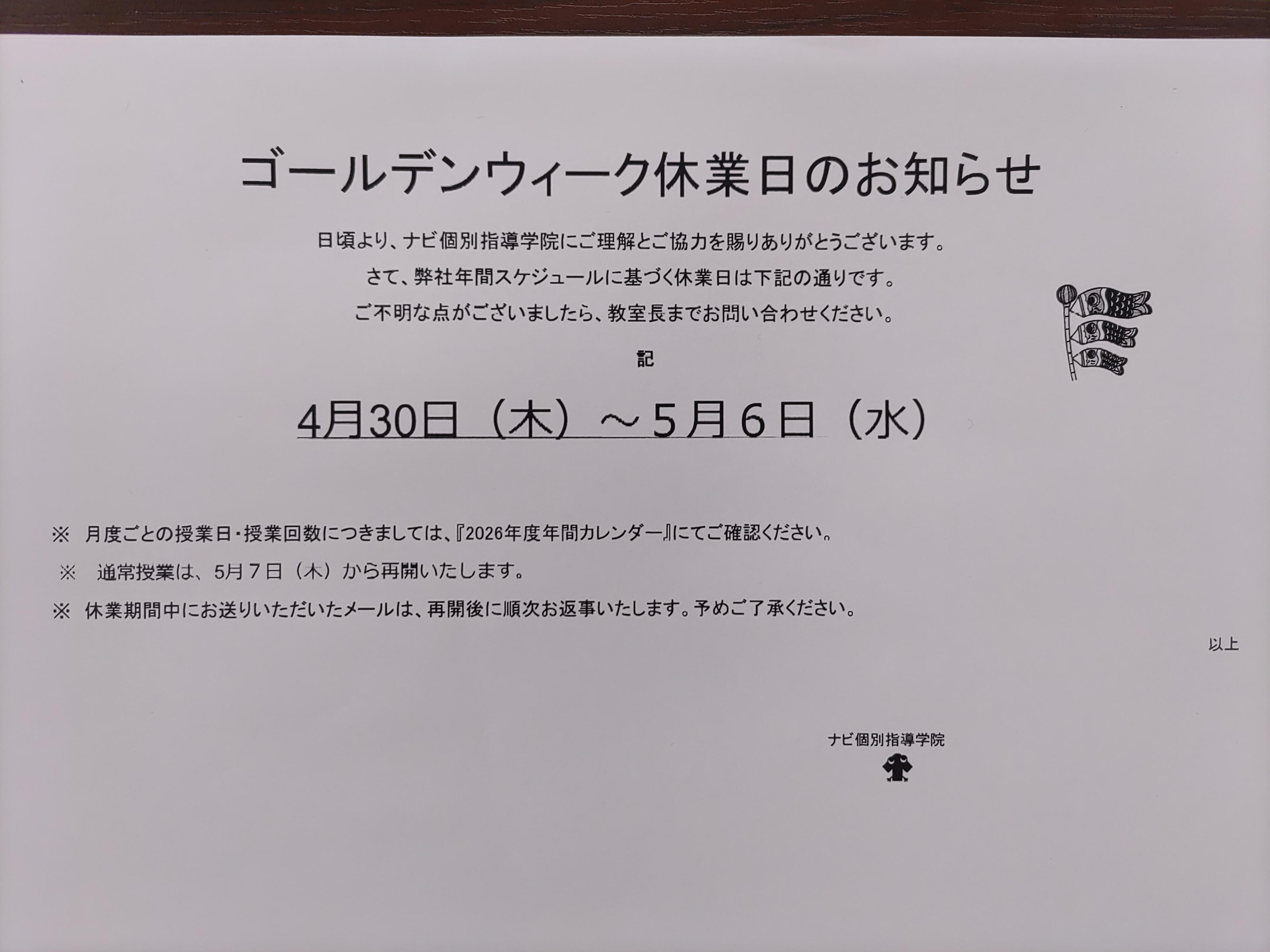 ナビ個別指導学院はGW期間休業とさせていただきます。
