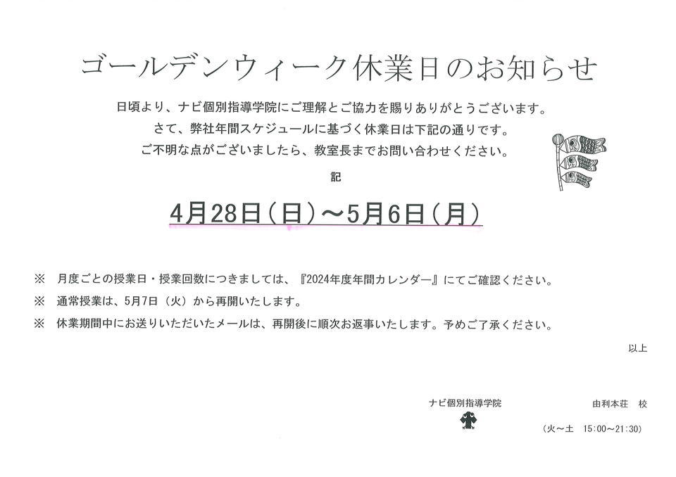 4/28(日) ~ 5/6(月) の間は休業となります。