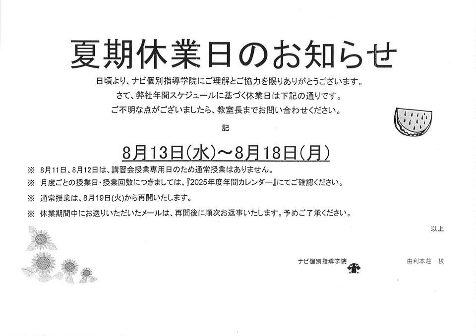 日頃より、ナビ個別指導学院にご理解とご協力を賜りありがとうございます。