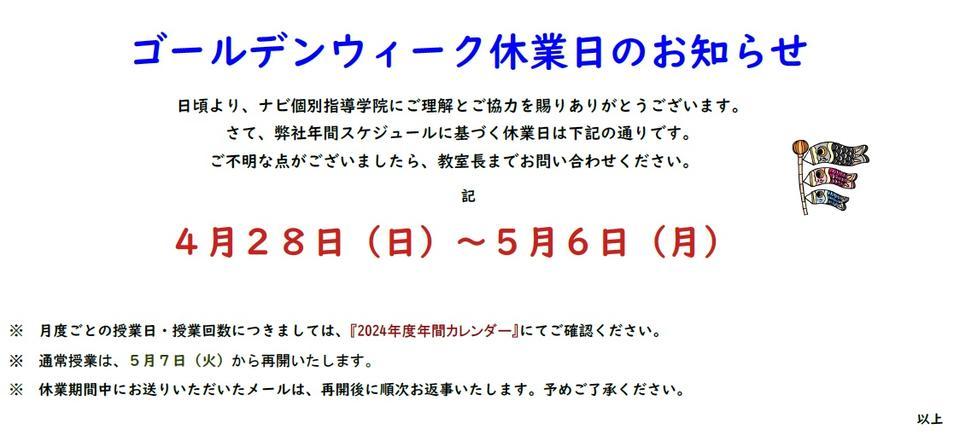 日頃より、ナビ個別指導学院にご理解とご協力を賜りありがとうございます。