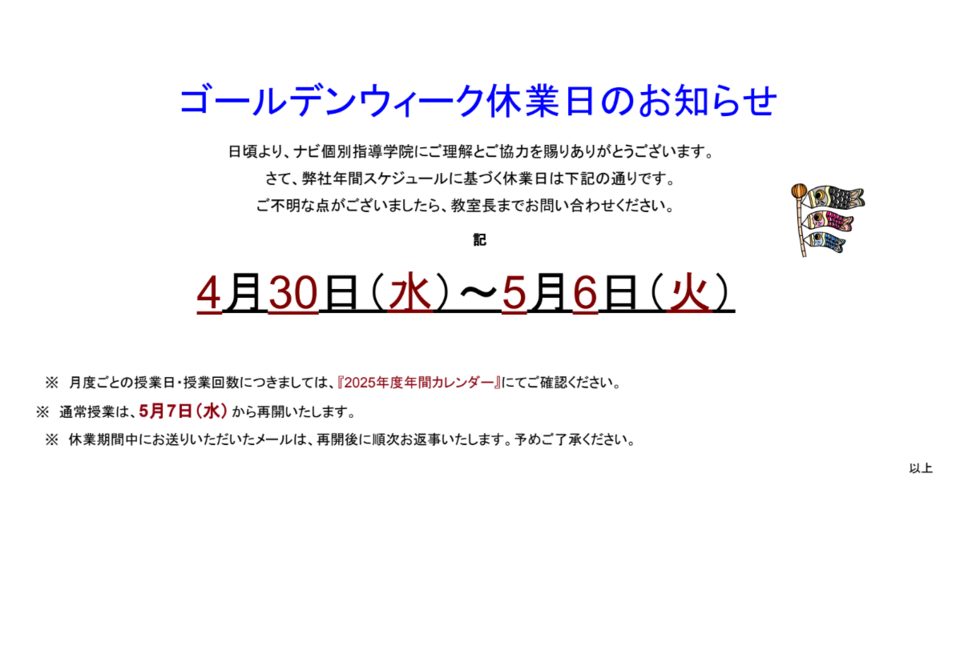 日頃より、ナビ個別指導学院にご理解とご協力を賜り