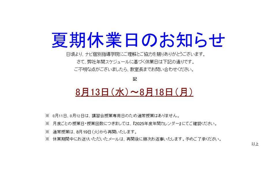 8/13(水)~8/18(月)の期間で夏期休業となります。