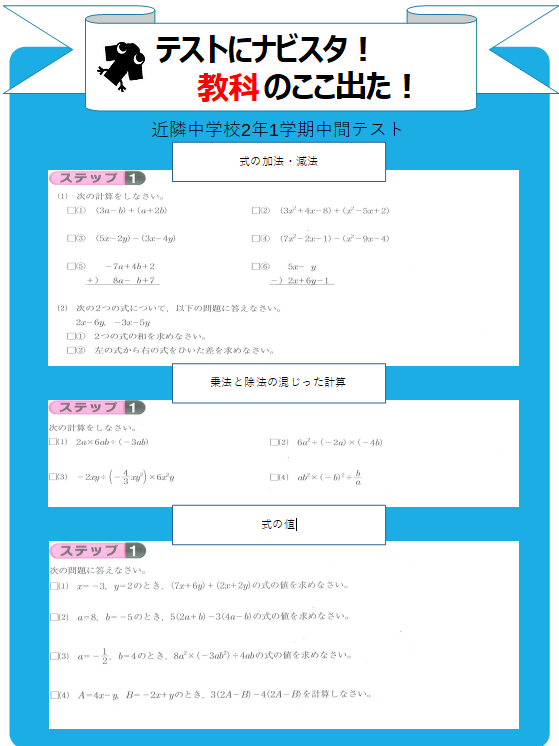 さて、今回もナビ個別の自社教材「ナビスタ!」と近隣中学校の定期テストの分析を「ここ出た!」で確認していきます!