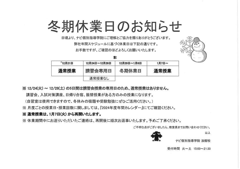 ※12/24(火) ~12/28(土)に関しましては、 講習会専用日の為、通常授業はお休みです。