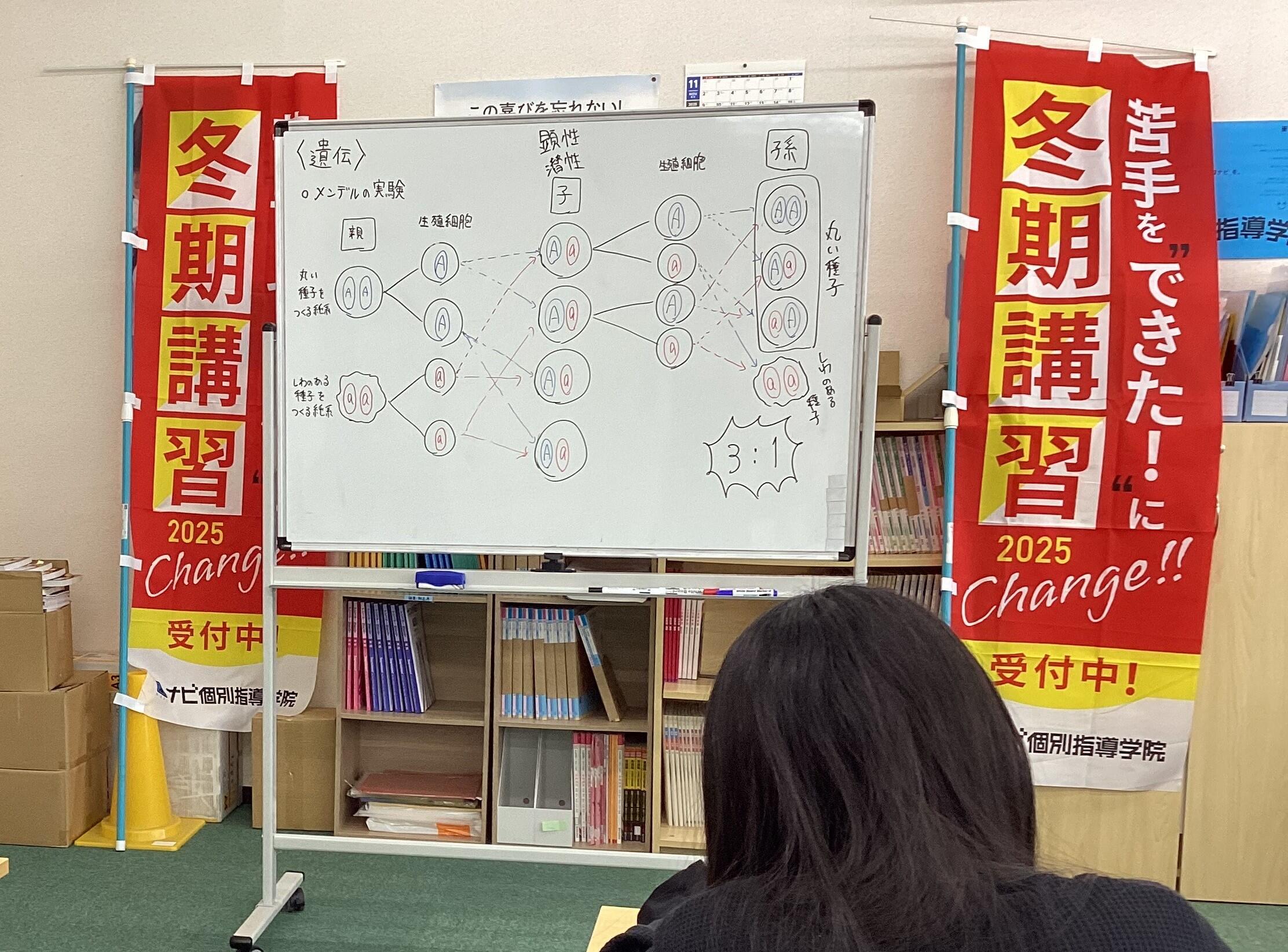 数学の2次方程式・2次関数など、理科は遺伝や運動の規則性など、3年生の範囲を中心に確認しました。