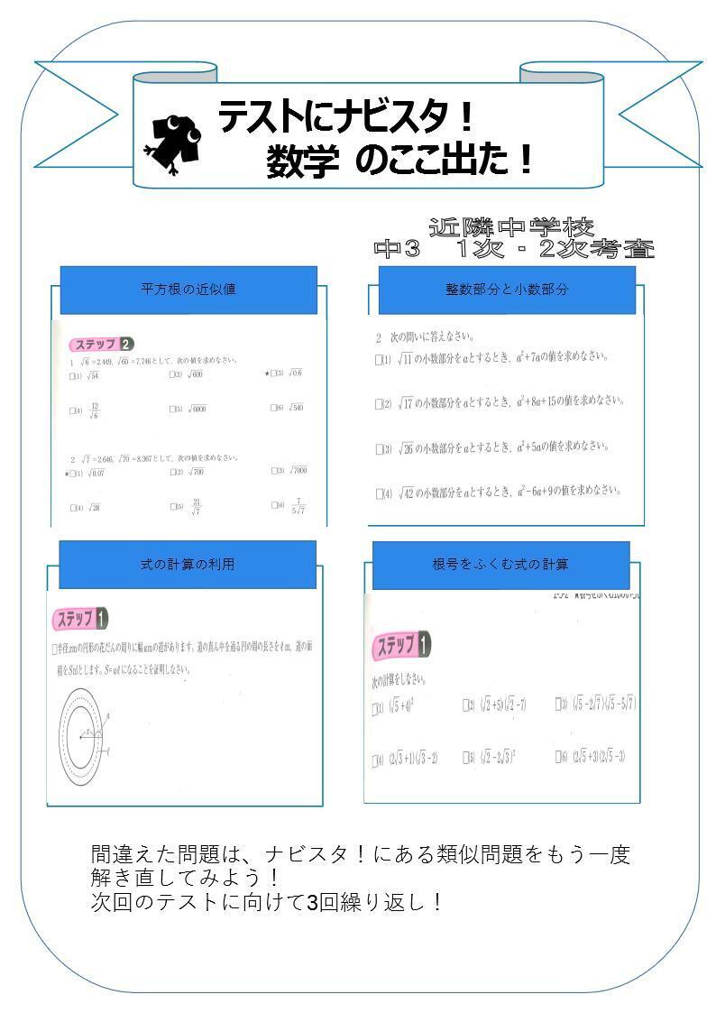 そこで、ナビ個別の自社教材「ナビスタ!」と近隣中学校の定期テストの分析を「ここ出た!」で確認してみましょう!