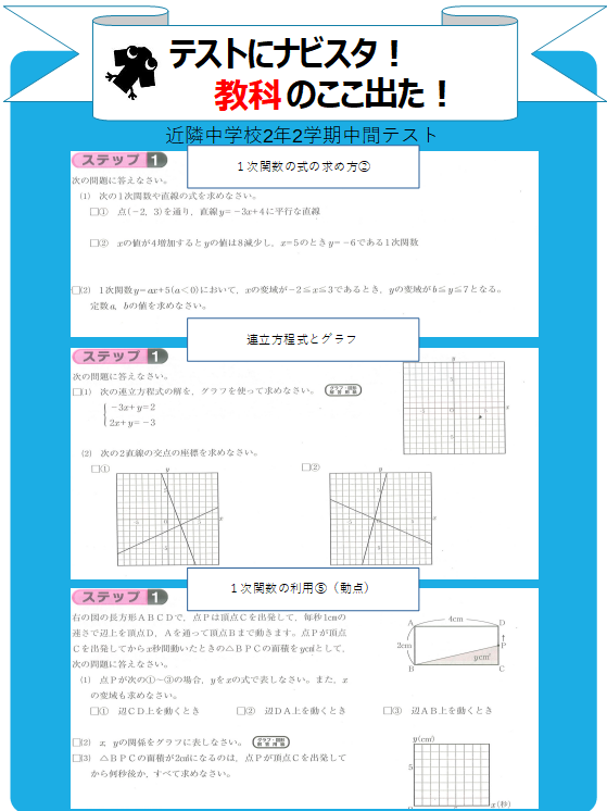 中2の今回の範囲は、1次関数の求め方、グラフ、応用問題がメインでした。