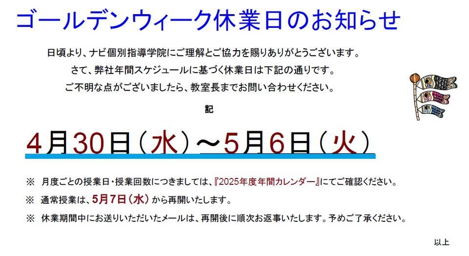 日頃より,ナビ個別指導学院にご理解とご協力を賜り,ありがとうございます。
