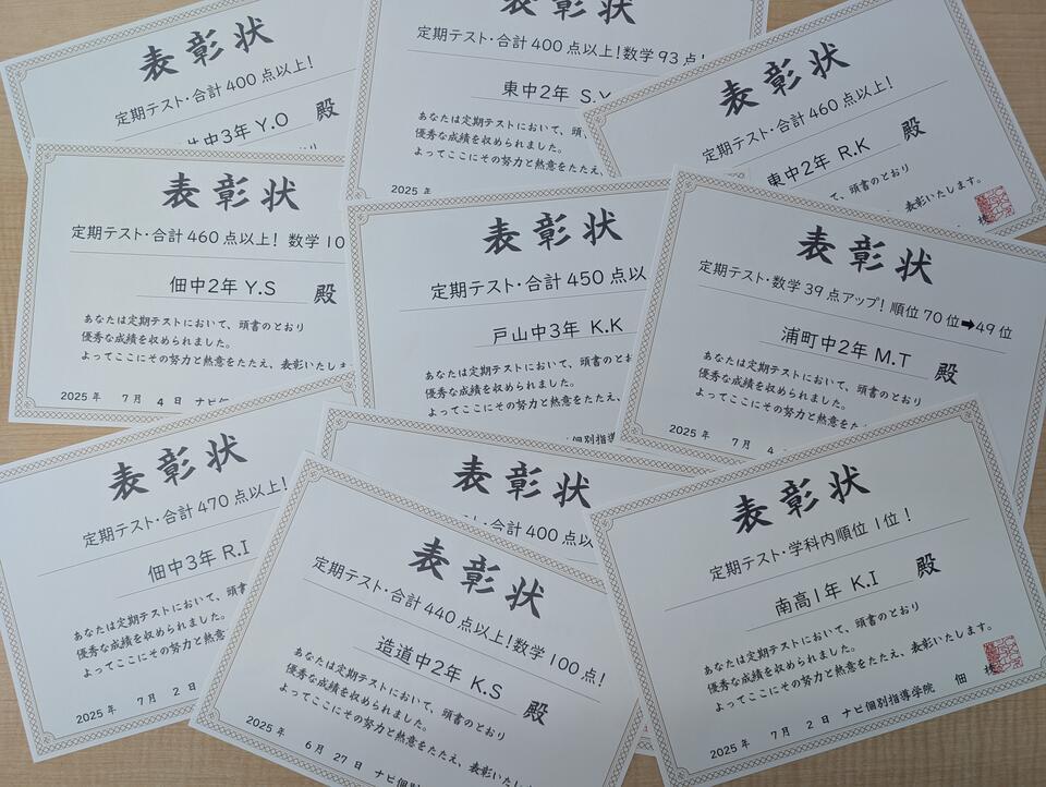 中高生は、定期テストが終わって集計結果が出始めた頃ですね。佃校では、成績優秀者や成績アップ者には表彰状を授与しています!