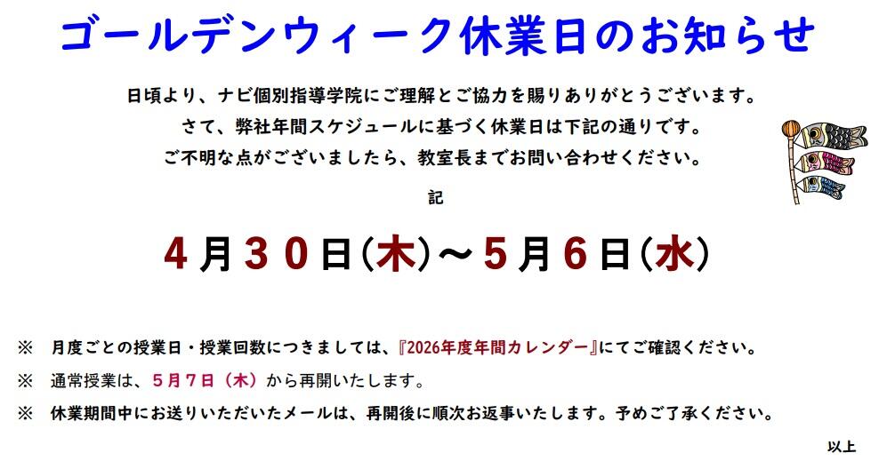 日頃より,ナビ個別指導学院にご理解とご協力を賜り,