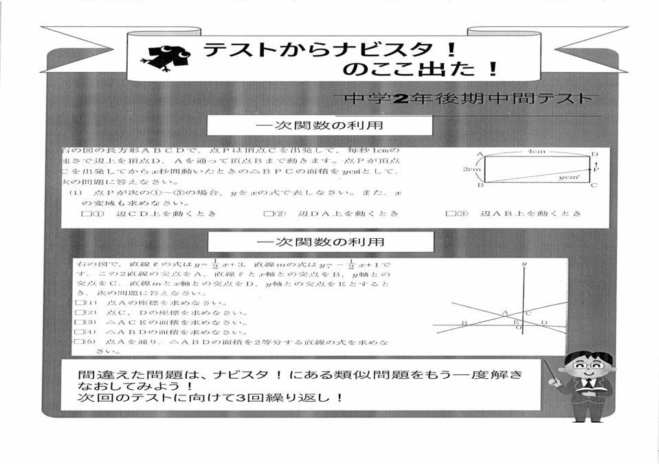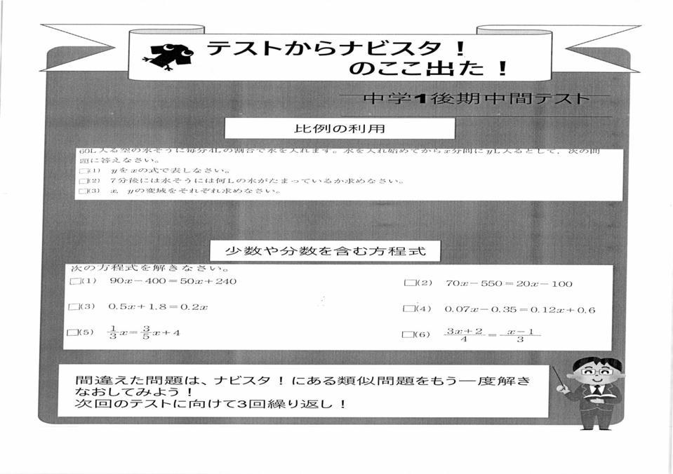 そこで、ナビ個別の自社教材「ナビスタ!」と近隣中学校の前回定期テストの