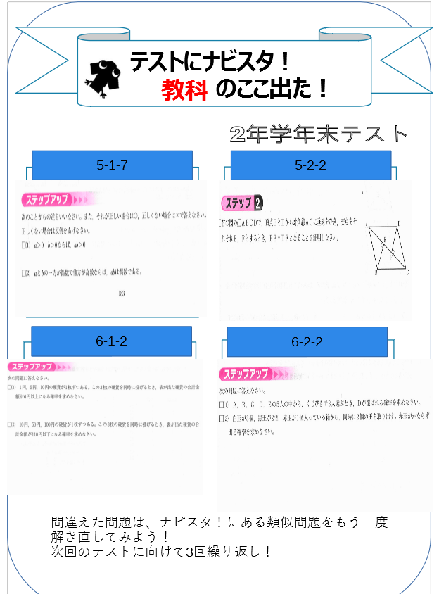 そこで、ナビ個別の自社教材「ナビスタ!」と近隣中学校の前回定期テストの