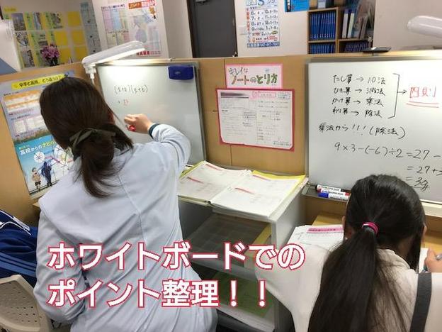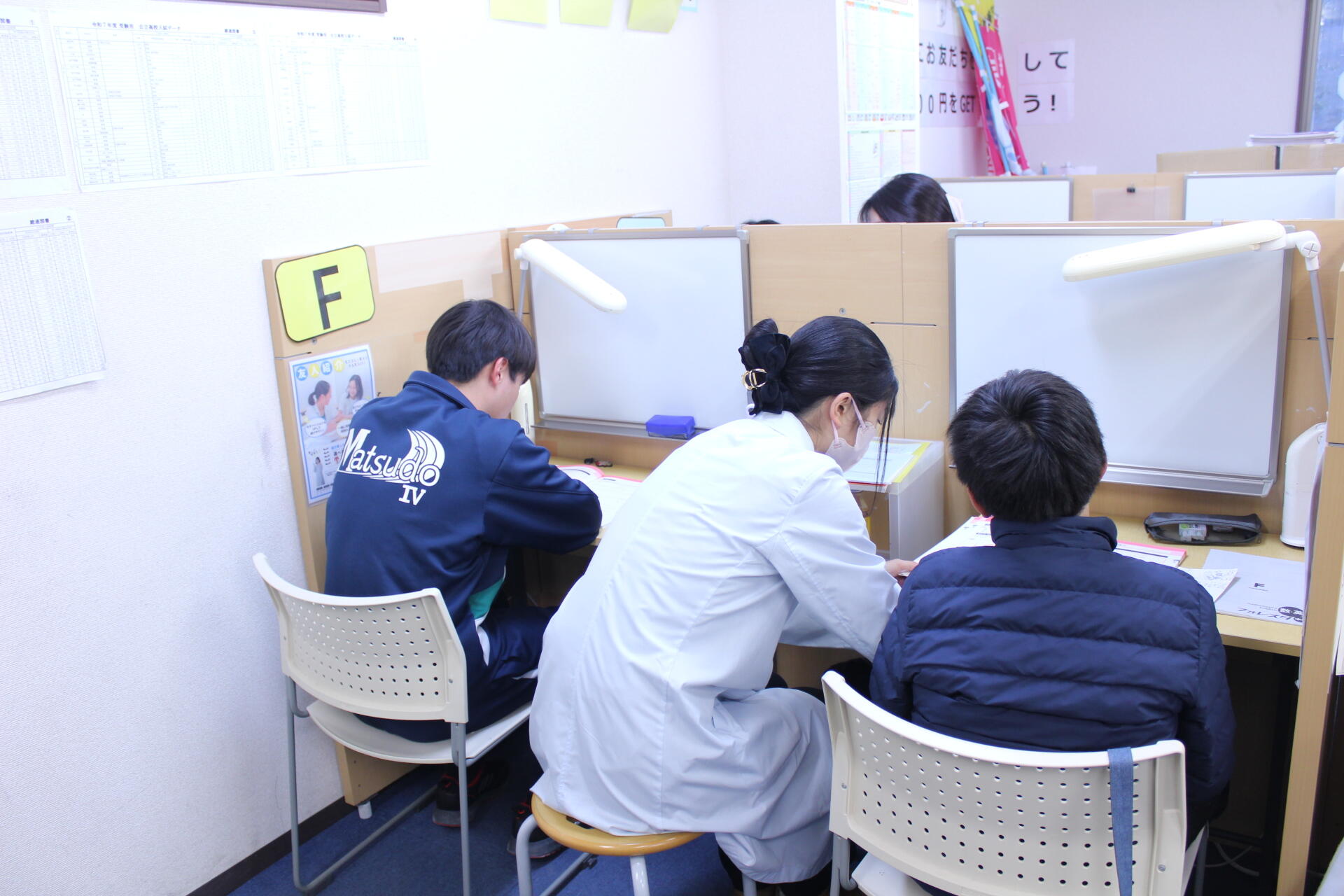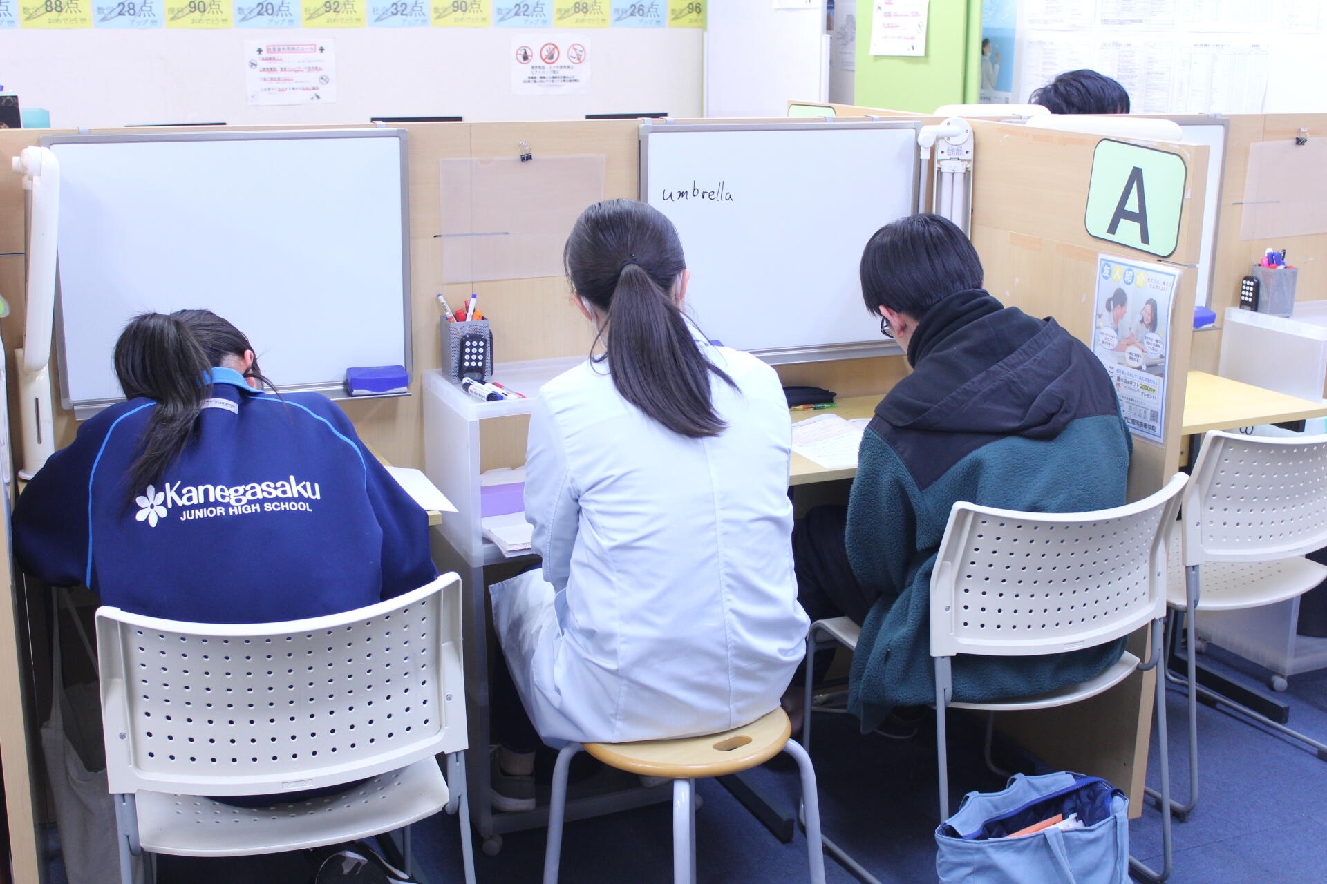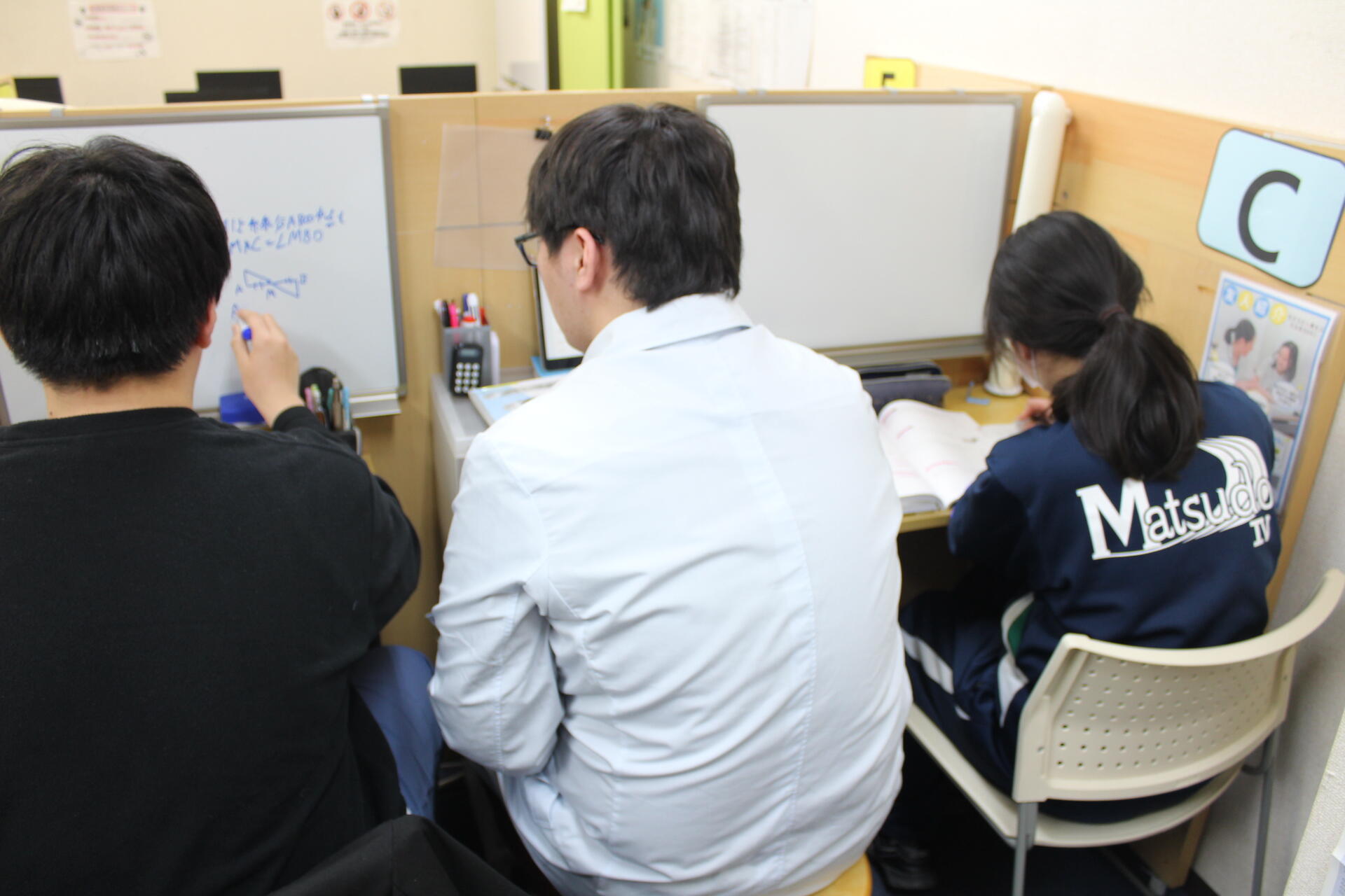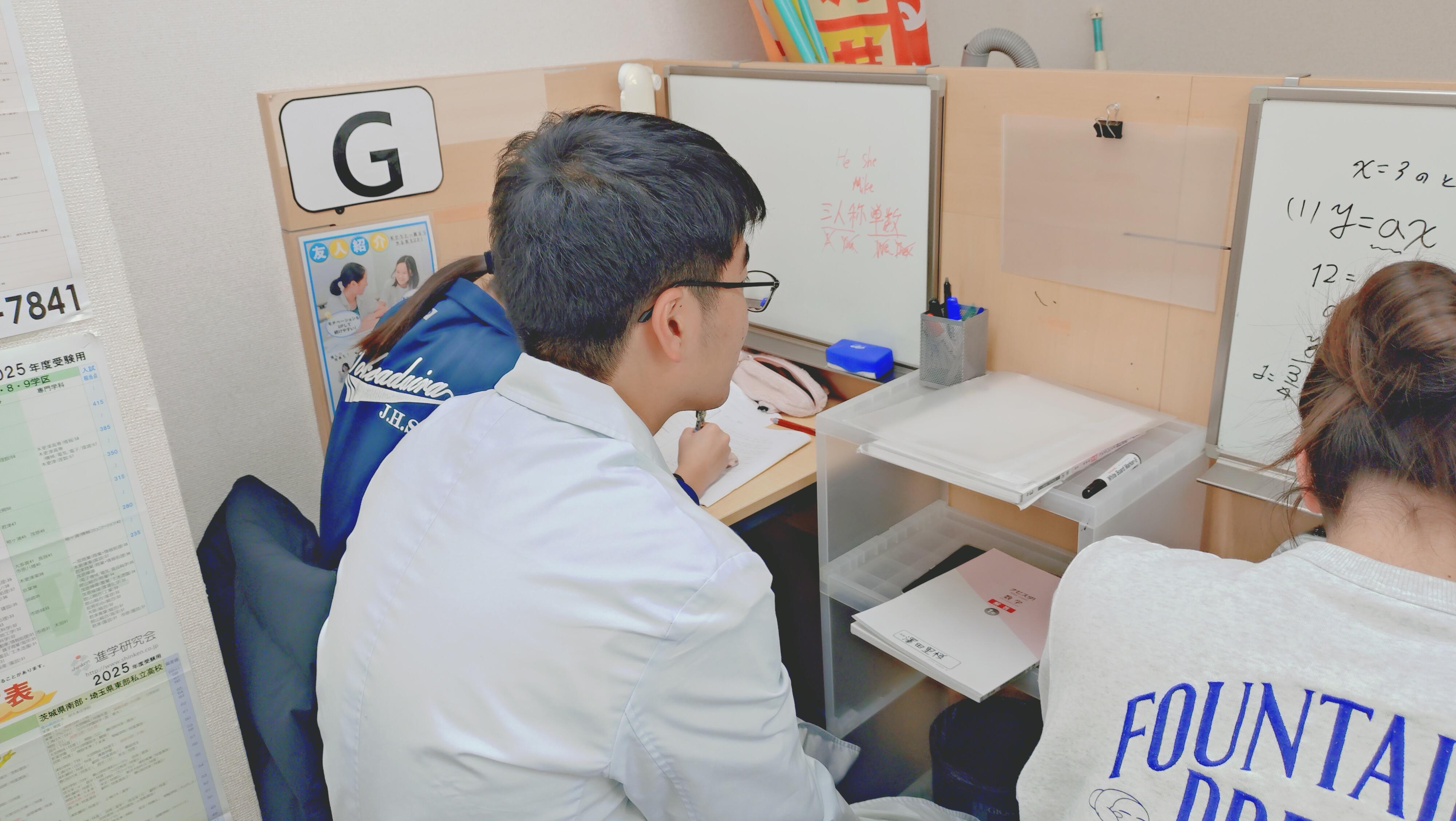 ナビ個別指導学院の授業は、個別の席ごとに設置された自分専用のホワイトボードで解き方や考え方を一緒に確認、それから生徒が問題を解くという「個別授業」スタイルです。