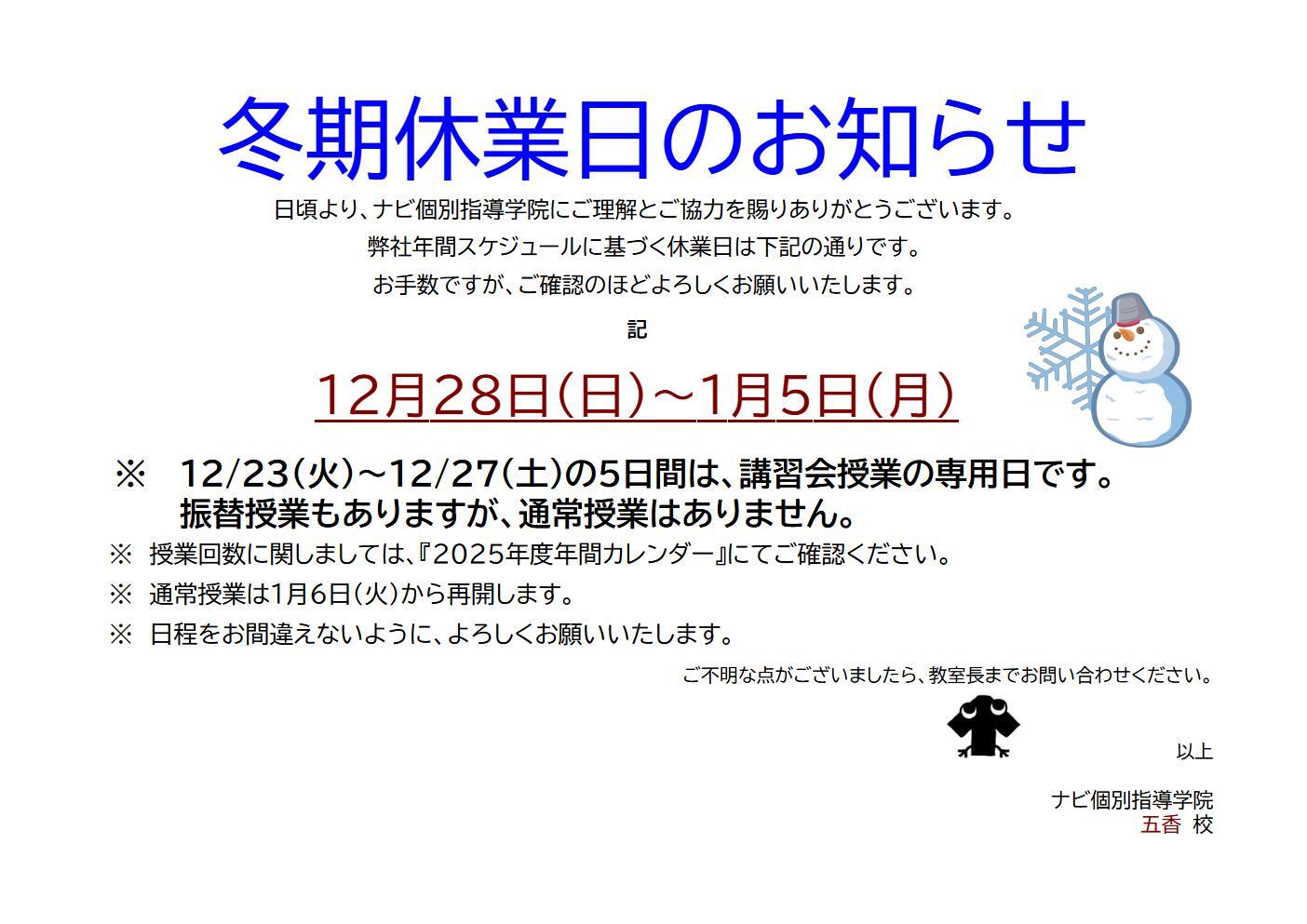 ナビ個別指導学院五香校は【 2025/12/28㈰~2026/01/05㈪ 】の期間にてお休みをいただきます。