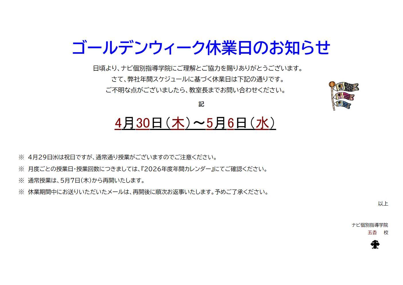 ナビ個別指導学院五香校では4/30㈭~5/6㈬にてお休みをいただきます。