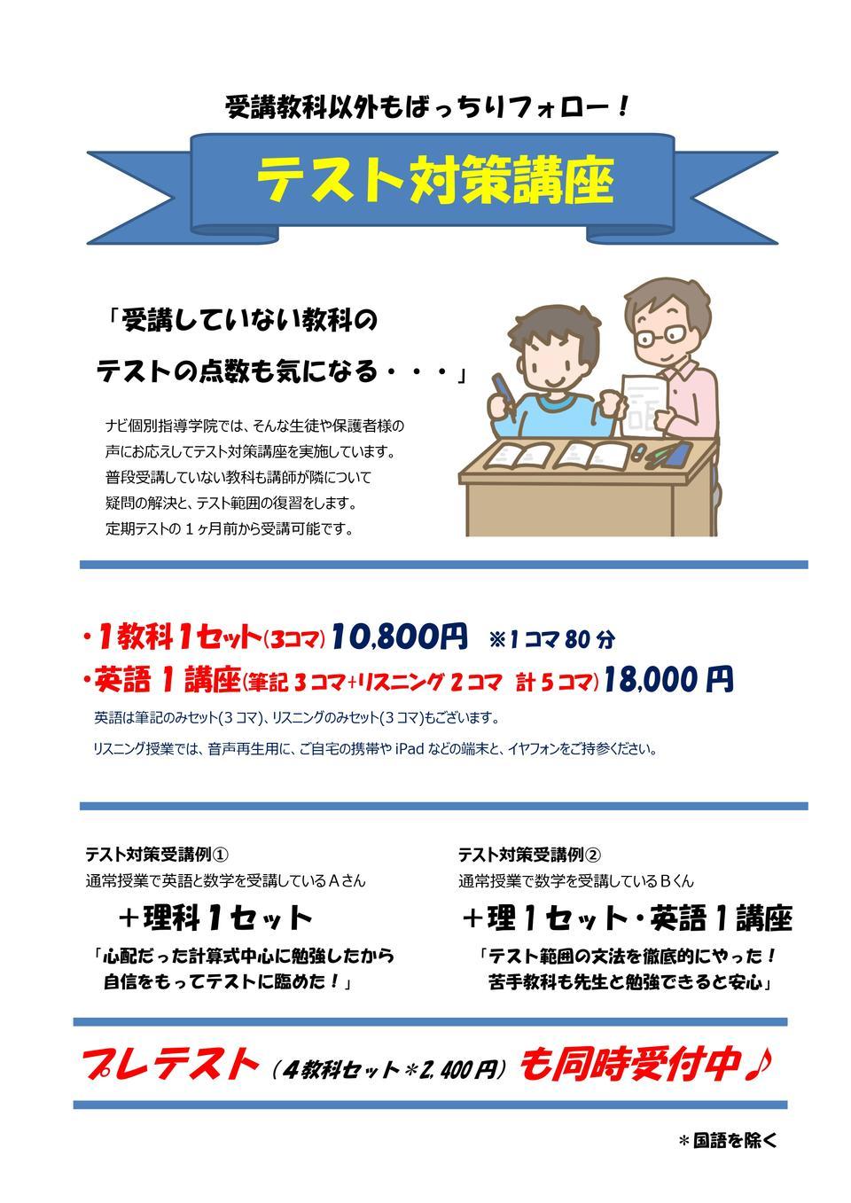 学校の定期テストの範囲に合わせてナビの先生たちと一緒に対策の授業が受けられるので是非是非ご参加ください♪