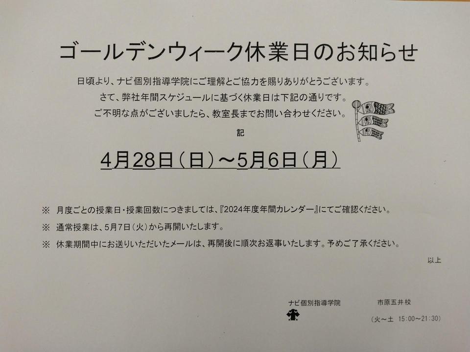 ゴールデンウイーク休業日のご案内 です。